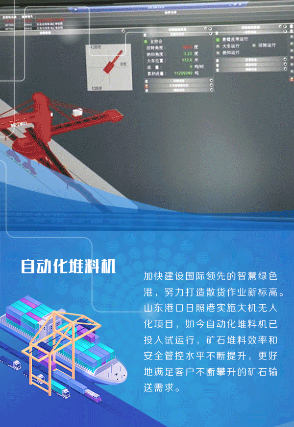 智慧賦能山東港口日照港,加快推進(jìn)智慧綠色港口建設,逐步實(shí)現現場(chǎng)生產(chǎn)管理無(wú)人化、自動(dòng)化、智能化。